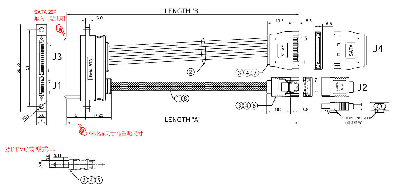 SATA 22P /母 180° TO SATA 15P /公+SATA 7P /母,二合一