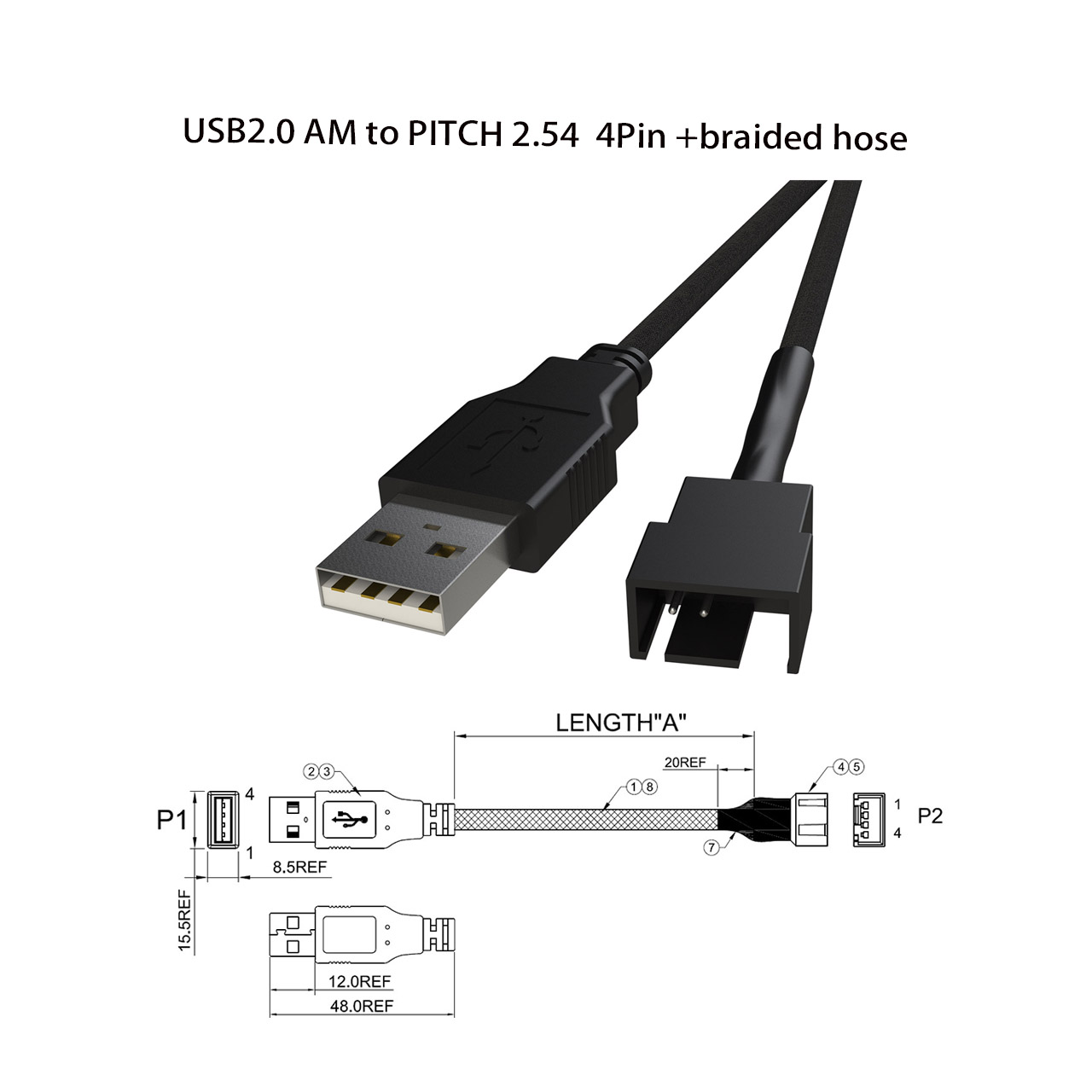 Fan cable USB2.0 AM to PITCH 2.54 4Pin +braided hose